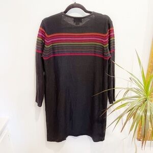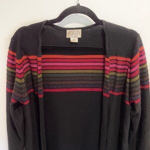 Such a fun cardigan! Brand is David Warren. Longline, retro rainbow stripes, size M