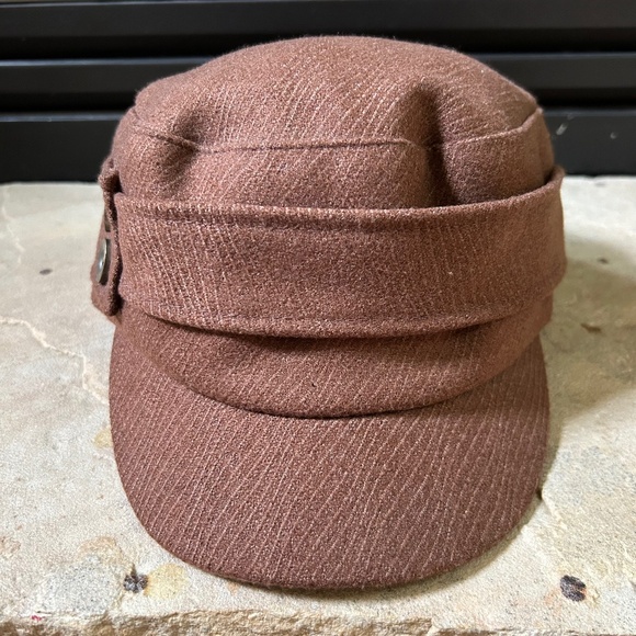 Women's David & Young hat, military style, brown, side button detail, elastic in the back, OS