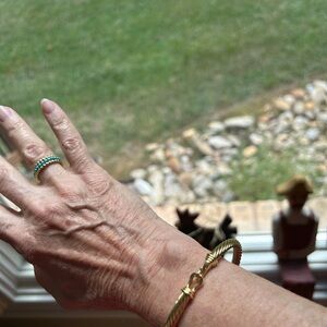 Enhance your style with this exquisite twisted 18k yellow gold bangle bracelet. Its elegant design is perfect for any occasion. David Yurman is the designer of this horseshoe closured bracelet. The total weight is 16.36 grams. The outside diameter is 8” and the inside diameter is 6.5”. This will fit a size 6 or smaller wrist well.
