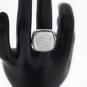 This authentic ring is by David Yurman from the Albion Collection, it is crafted from 925 sterling silver. The ring features a cushion shape top set with sparkling pave diamonds with black diamond halo. Cable design around the bridge with smooth polished shank and band. It is signed D.Y 925