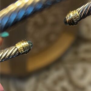 Classic Cable Bracelet. Sterling silver with 14k yellow gold and blue topaz. This bracelet has never been worn. Recently buffed and cleaned. Tried my best to get a clear photo of the DY stamp as well as the 585 and 925 indicating 14k gold and sterling silver.