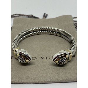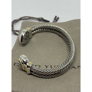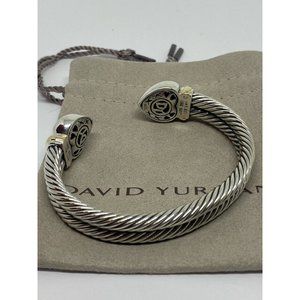 Signed David Yurman 18K, 14K and Sterling Silver Heart Cable Heavy Cuff Bracelet. In very nice preowned condition. The piece measures 6.5” inside circumference . The cable portion measure 3/8" wide and the hearts measure 5/8" 46.6 grams total weight.