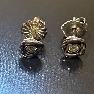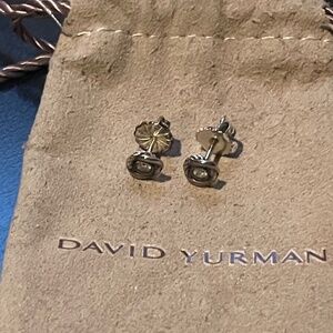 David Yurman Infinity Stud Earrings in 925 Sterling Silver with Diamonds, 6.8 mm are elegant earrings crafted in silver with sparkling diamonds that are part of the Crossover Collection and perfect for adding a touch of luxury to any outfit for any age. They are a fresh take on the ancient symbol with a pair of elliptical smooth and cable links interlaced in perfect harmony Total weight of diamonds is 0.13 carats. The earrings were barely used and in great condition as purchased to replace a "lost" pair which were found soon thereafter. Comes with original