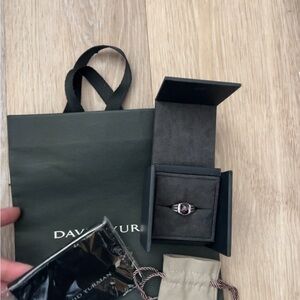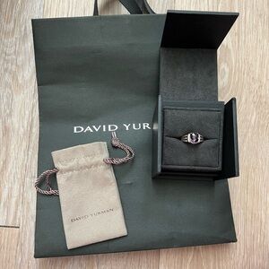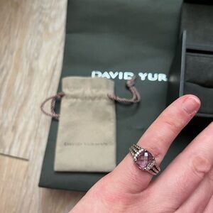Elegant David Yurman ring featuring a striking amethyst stone set in silver. Comes with original packaging including box, dust bag, cleaning org, and shopping bag. Size 8. In great condition! Some very minor scuffs on the bottom but can be cleared at David Yurman.