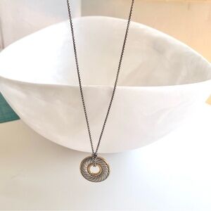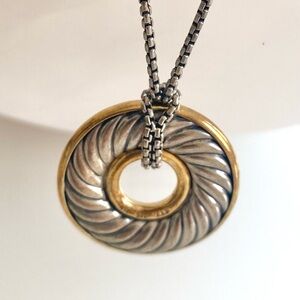 David Yurman Vintage Sterling Silver 18 inch box chain necklace with Classic Cable sterling silver and gold large disc pendant. Excellent condition. Disc circumference is 1 1/4 “