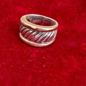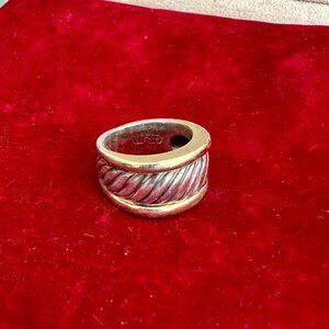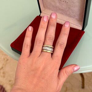 Authentic David Yurman two-tone cable cigar band ring in sterling silver and 14k yellow gold. Classic DY cable detailing with a bold, polished finish — a statement piece that’s hard to miss.