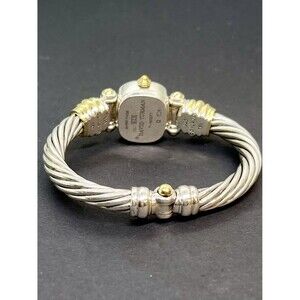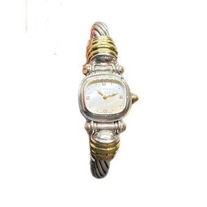 I recently had this inspected, cleaned and battery replaced by my watch repair shop. The pictures don't do justice to this beautiful watch. The face is an opalescent pink blue hue with four diamonds and 18 kt. sticks to tell the hours by. Elevate your style with this stunning David Yurman wristwatch featuring an square shaped 20mm sterling silver case and a luxurious bracelet/link band in silver and gold. The diamond pattern on the mother of pearl dial adds a touch of elegance, complemented by stick indexes that make it easy to tell time. Swiss made with a quartz movement, this classic timepiece also boasts a 12-hour dial and a 12-hour bezel type.