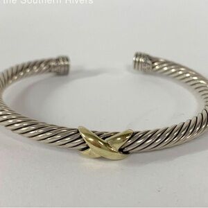 David Yurman Cable Crossover Bracelet in Silver/Gold with a twisted design is a stylish and elegant piece of jewelry. 5mm wide Made of sterling silver 925 with a gold x in 14k, this cuff bracelet features a unique twisted design that adds a modern touch to any outfit. The cable chain style and pavé setting make it a versatile accessory that can be worn alone or stacked for a trendy look. This bracelet is signed by David Yurman and is part of the Crossover collection, showcasing the brand's commitment to quality craftsmanship and timeless design.