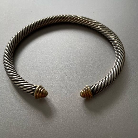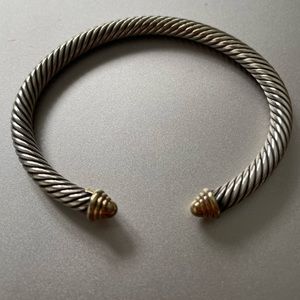 Two toned (silver and yellow gold bangle). Pre-loved, in great condition. Original price of 550 on David Yurman website. Comes with used polishing cloth and David Yurman pouch.