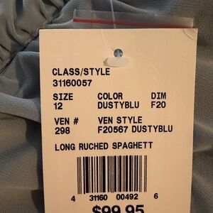 David Bridal bridesmaid dress. Long, ruched, spaghetti strap. Dusty Blue. Size 12, never worn. tags on.
