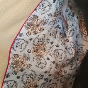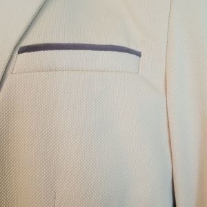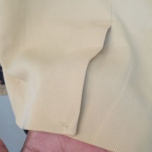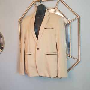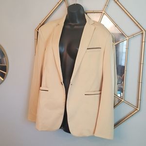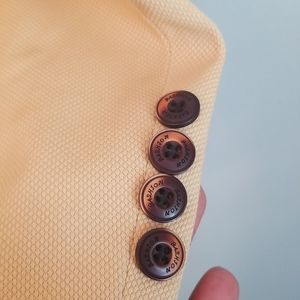 Golden butter yellow, textured, brown trim, front pockets, inner pockets, lined, hankie pocket, 1 button closure, notch lapel, fun lining. Measures approximately pit to pit 21" 40R, 29" long, 20" waist, 25" sleeve, 18.5" shoulder, 4 button sleeve, 1 back vent, and new without tags.  marked size large.  View all photos as they are apart of description and contain significant information and is exact item you will receive.  May be removed at anytime due to Co listing.  Thanks for looking.  Item 1001.00