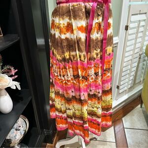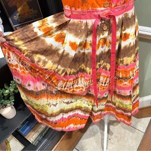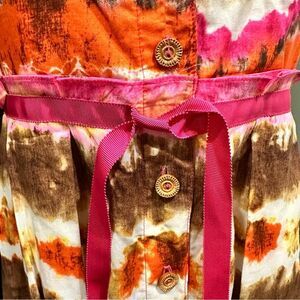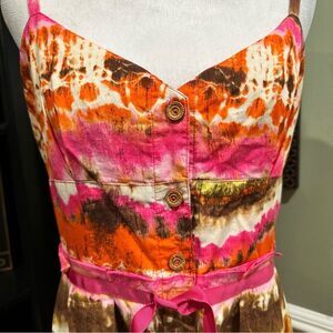 Make a statement in this vibrant David Meister sundress! Featuring bold tie-dye stripes in shades of orange, pink, brown, and yellow, this eye-catching dress is crafted from 100% cotton and fully lined for comfort. The flattering silhouette includes a smocked back, a sweetheart neckline, and decorative buttons down the front and side. A grosgrain ribbon belt cinches the waist for a polished finish.