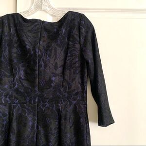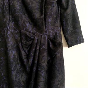 David Meister lace dress with bow detail at waist. Purple fabric underneath black lace. Worn once, perfect condition. Fully lined. Invisible zipper in the back. Flattering darts throughout.