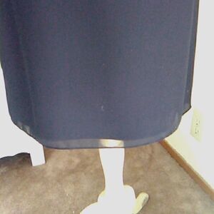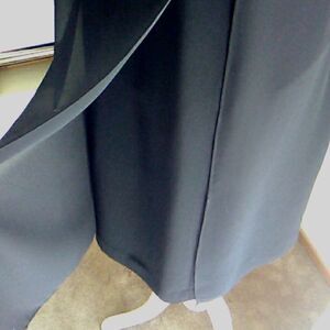 A spin on the classic little black dress. This is a sheath style with a sheer overlay that is vented at the side seams. Seaming for fit. Three layers all together: full lining, crepe sheath, sheer overlay. Back zip. Bound neck and arms. Size 8 measures 38 at chest, 34 at waist, 40 at hips, ,40 long from shoulder to hem. Simple and elegant for your special occasion.