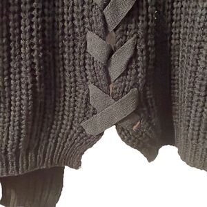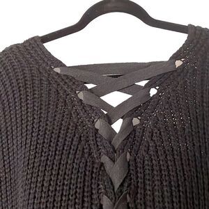 David and Young black laced back open front sweater One Size. Ribbed knit. Modern. Lacing Is done with wide, soft fabric and is not adjustable. It’s looser at the top back for a nice effect. Gives some warmth and style. Neutral black works with everything.
