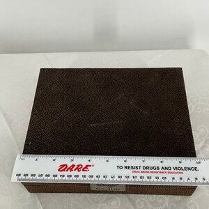 Light stain marks inside. There are a couple of indentions on the top where something was set on it. They are lines about 2". Exterior measurements: 8.5 inches wide, 9.5 inches long, 2.5 inches tall