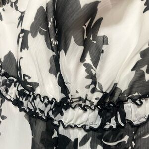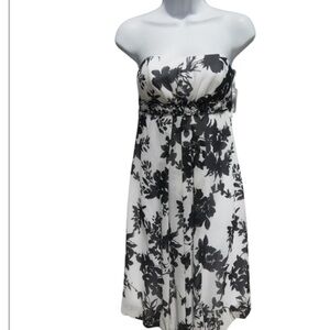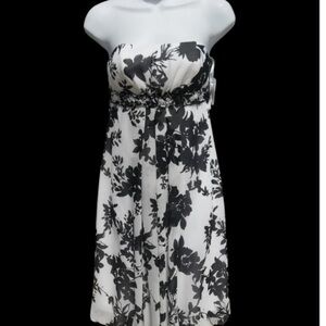 This sophisticated sundress by David's Bridal showcases a striking black and white floral pattern, perfect for a wedding guest or cocktail event. The strapless design features a fitted bodice that elegantly transitions into a flowing skirt, offering a chic and timeless silhouette. Crafted with attention to detail, this dress embodies elegance and style for any special occasion.