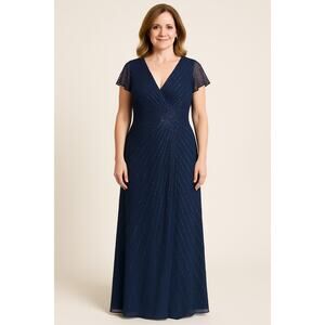 A plunging V-neckline and soft pleating lend an elongating effect to this intricately beaded short sleeve dress.