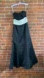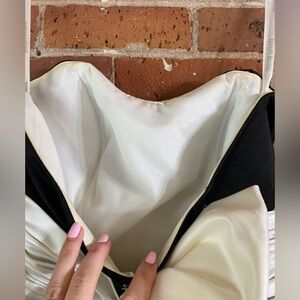 This elegant strapless gown by David's Bridal features a striking black and white color combination, perfect for a wedding, prom or gala type events.