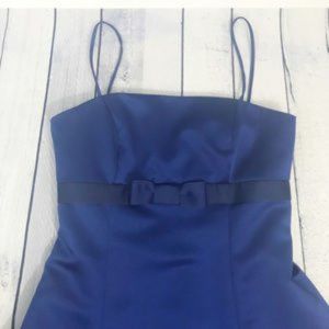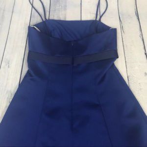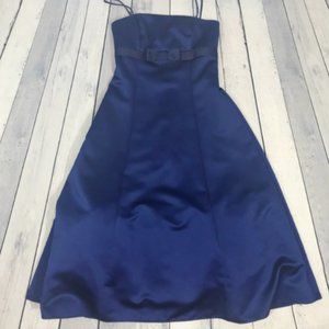 David’s Bridal Spaghetti Strap Empire Waist Satin Dress in the Color Blue Velvet. Ribbon bow detail around empire waist. Hidden Zipper Back Closure. Fully lined with tulle in skirt for added body. Perfect for a bridesmaid, prom or any formal event. Excellent Condition. Tag size 4. Approximate measurements laying flat: armpit to armpit 15”, empire waist 14”, length shoulder to hem 46”.