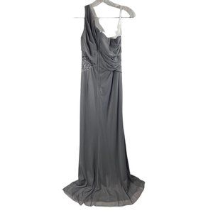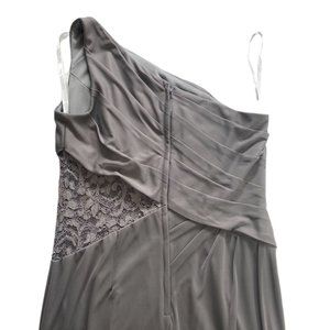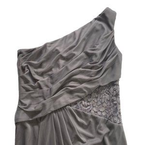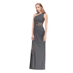 Davids Bridal - Bridesmaid Dress - Grey One-Shoulder Mesh Dress with Lace Inset