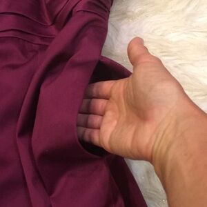 David’s Bridal Pleated Dress. Wine color. Bridesmaids dress with pockets. 100% cotton. Lined. Very comfy. Worn only once. Has been dry cleaned since. The model shot is for styling and fit only. This dress runs true to size and was NOT altered.