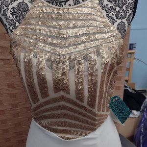A simple gold sequinned halter top dress with a long white skirt with a 29-inch slit. The sequinned are in great condition and are as shiny as ever. The skirt is so soft and have a nice lining underneath. There is an open back and a tie up top.
