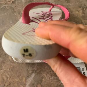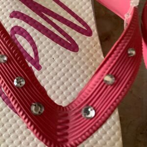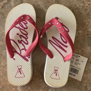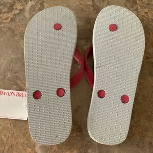 David’s Bridal Bridesmaid white/pink with clear rhinestones flip flops, brand new, tags attached, some original discoloration, size M (7-8)