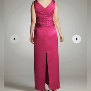This satin sleeveless dress is both flattering and feminine. With a fitted ruched bodice and slim skirt, it is the perfect dress to show off some curves.