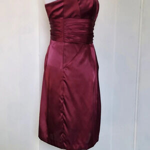 David's Bridal Burgundy Satiny Strapless Dress Ruched Waist and Pockets