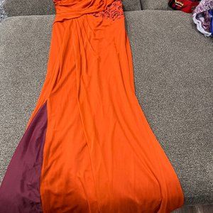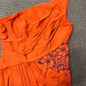 I'm selling this size 2 David's Bridal Dress. It was worn one time to a wedding, so it's still in great condition. It has one shoulder strap and a flowery lace design on the left rib. I am asking $50.00 for this dress. It is a burnt orange color with a dark purple (almost muave) color where skin would usually peek through in the slit of the dress up the leg and on the left rib.
