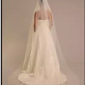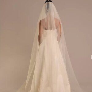 Simple, elegant raw edge chapel soft tulle veil. Worn once for ceremony. Needs to be steamed and hung before wearing.