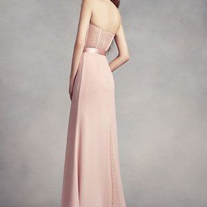 Delicate lace details the back and softens the skirt of this strapless chiffon bridesmaid dress from White by Vera Wang. Floor-length gown, tailored for someone who wears a size 4-6 (34B).