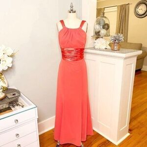 David’s Bridal Long Coral Halter Chiffon Long Bridesmaids Dress. Gorgeous dress. Lined, zips in back. Ties in back. Like new. Size 12.