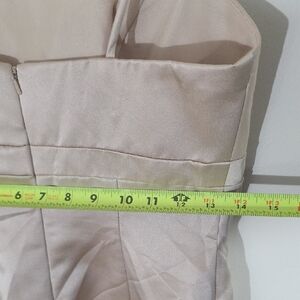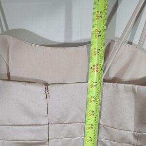 This elegant cream sundress by David's Bridal is designed with a ruched bodice and delicate spaghetti straps, featuring a sweetheart neckline. Ideal for wedding guests, the dress offers a graceful silhouette with a knee-length hem, perfect for both formal and semi-formal occasions.