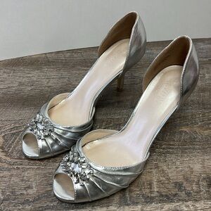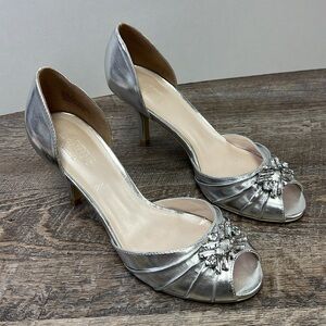 David’s Bridal DESI Silver Metallic Embellished Peep Toe Pumps Size 9