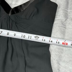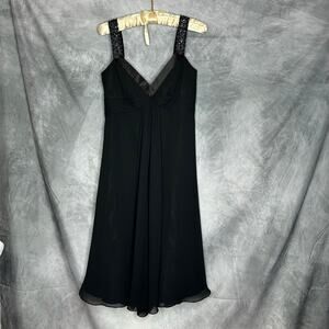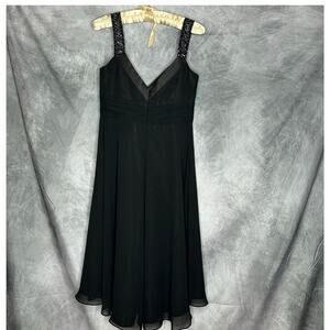 Stunning black Dave's Bridal dress perfect for weddings or special occasions! This knee-length dress features a flattering flowing silhouette, sleeveless design, and shiny bead embellishments on the sleeve straps that add a touch of elegance. It's in excellent condition and ready to make you shine at your next event.