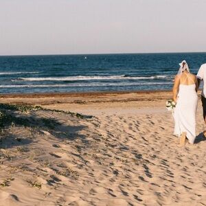 Stunning white wedding dress by David's Bridal. Features a sleek design with a flattering fit. Perfect for a modern bride.