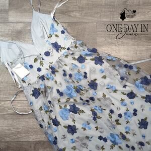 A most enchanting gown that shall render any lady the very picture of elegance, featuring delicate floral embellishments upon layers of ethereal mesh that dance with every step. The sweetheart neckline speaks to romantic sensibilities while the flowing length ensures one cuts a most graceful figure at any gathering. Fashioned in a becoming shade of blue, this dress promises to secure the wearer many an admiring glance at balls, soirées, and other occasions of consequence.