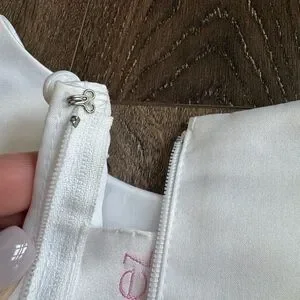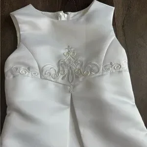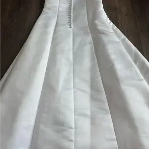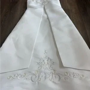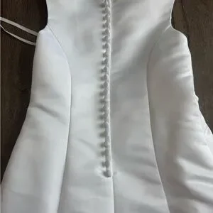 David’s Bridal Flower Girl Dress. St. Tropez brand, girls size 5. White. Great used condition- worn one time. It does have few very small spots. Could used a spot treatment or dry cleaned. Also, the silver “clip” at the top of the zipper is missing the hook. Doesn’t impact the dress at all, but just to be transparent!