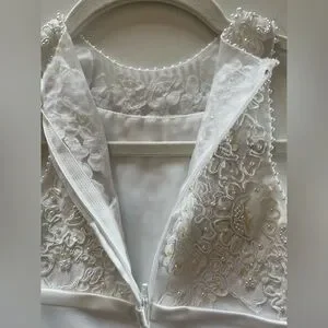 White with pearls, back zipper, sleeveless, 5 layers of tulle/lining to make for a full skirt