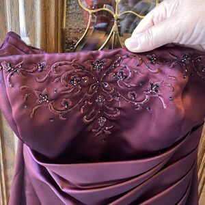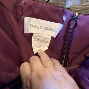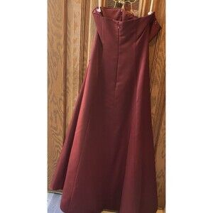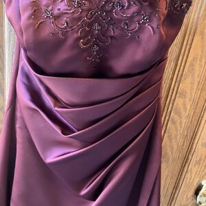 David's Bridal Formal Bridesmaid Gown Burgundy Beaded Satin Strapless Size 8 Wrap Used / excellent / see photos Waist: 30 in Bust: 34 in Length: 50 in