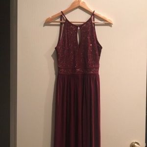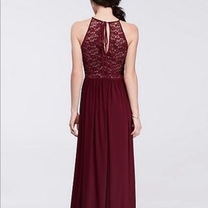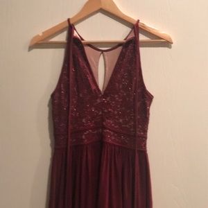 This formal dress is very pretty and ties in the back around the neck. The color is maroon. There hasn’t been any alterations to the dress. It is still the same length as when bought brand new from David’s Bridal. It is very beautiful! Can be worn for prom, homecoming, or as a bridesmaid dress. Excellent, like-new condition. No rips, stains, or tears. From top of shoulder to hem is 60 3/4 in. This dress hasn’t had any alterations. It’s the same length as sold at David's Bridal. Smoke-Free Home.
