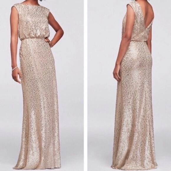 David's Bridal Gown Medium Womens Gold Sequin Long Formal Wedding Party Dress