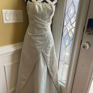 David's Bridal Gown prom Fit Flare A line Floral Beads accent  mint green crisscross waist SZ2 back zipper puffy Hem .pre owned in good used condition no tear no noticeable stain see all pictures any questions please message