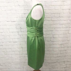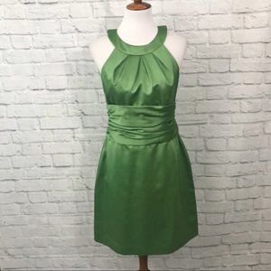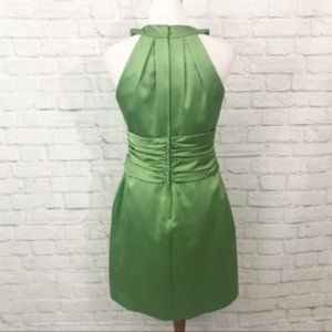 David’s Bridal Green Satin Halter Dress. Style F13277. Features a pleated bust and ruched waist. Figure flattering shape for all body types. Excellent Condition. Worn once. Perfect for any formal event. The tag has been cut out but this is a tag size 8. Approximate measurements laying flat: armpit to armpit 17”, waist 15”, length shoulder to hem 38”.