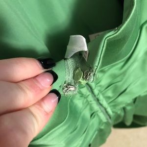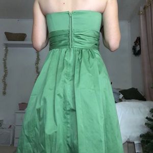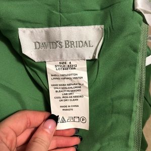 David’s Bridal green strapless dress. It goes down to a little above my knees and I’m 5’8. Very nice thick material. No stains. Practically brand new. Just a little too small for me.