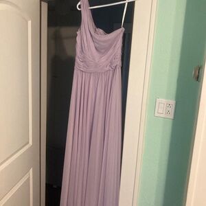 David’s Bridal 1 shoulder dress size 10, Iris color. Worn for 2 weddings. No alterations made, other than tacking pads into the bust. Some discoloration at the hem of the skirt, which could be removed if alterations were made. The side zipper sticks a bit because of the style of the dress. The one I tried on in the store was the same.