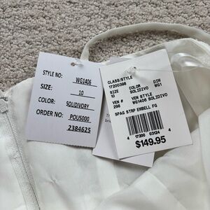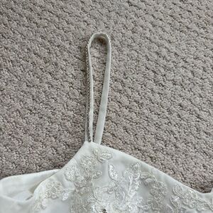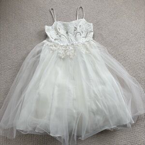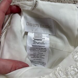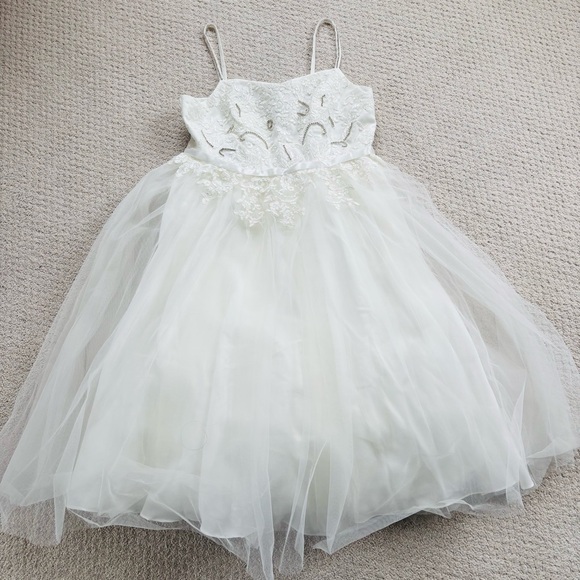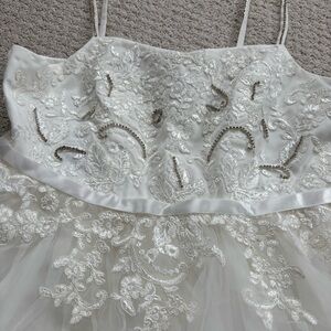 David's Bridal Ivory Floral Appliqué Spaghetti Strap Flower Girl Dress. Style WG1406. This is an ivory off white. Crystal accents, tulle skirt. Zipper back. New with tags. Would also be perfect for first communion or other special events.