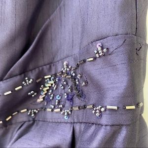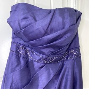 David’s Bridal Lapis purple maxi shantung a-line strapless column gown dress with beaded waist. Rear zip. Boned, lined bodice. The purple color is closest to the stock photo. My pix look more blue.